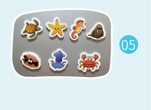 5️⃣Zwierzęta wodne – 7 szt. – małża, kalmar, kałamarnica, krab, konik morski, rozgwiazda, mors, żółw