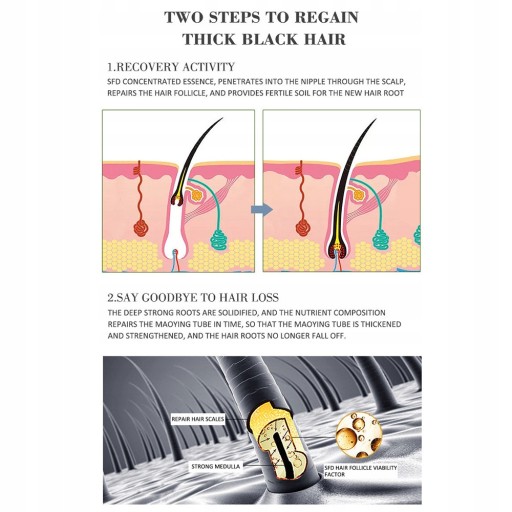Może normalizować krążenie krwi w skórze głowy, promować metabolizm skóry głowy, aktywować tkankę mieszków włosowych, skutecznie zapobiegać utrata włosów, białe włosy, stymulować nowy wzrost, hamują swędzenie skóry głowy i wzmacniają korzenie włosów.