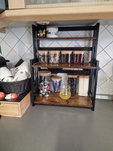 Każda półka może wspierać do 15 kg, pozwalając swobodnie umieścić na nich zestaw kawy lub słoiki z przyprawami.