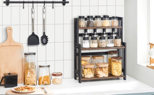 Ten stojak na przyprawy zwiększa przestrzeń magazynową, upraszczając przechowywanie słoików z przyprawami, żywności w puszkach i innych przedmiotów, które mogą wprowadzać chaos.