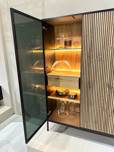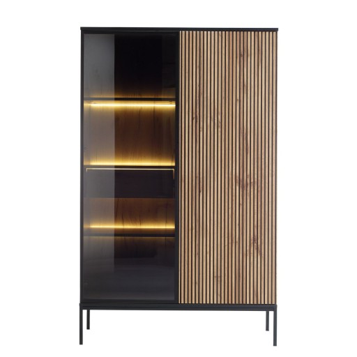 Высокая витрина SENTO с фрезерованным фасадом и выдвижным ящиком со светодиодной подсветкой