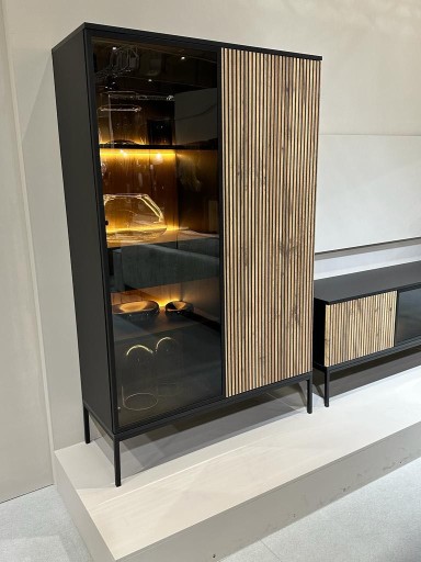 Sento to witryna, która zachwyca swoim frezowanym frontem wykonanym w urokliwym odcieniu dębu wotan. Dzięki naturalnej barwie drewna, mebel ten wprowadza niepowtarzalną elegancję i przytulność do Twojego wnętrza. Korpus witryny utrzymany jest w głębokim kolorze czarnym, co tworzy wyjątkowy kontrast i nadaje całości niezwykłego charakteru.