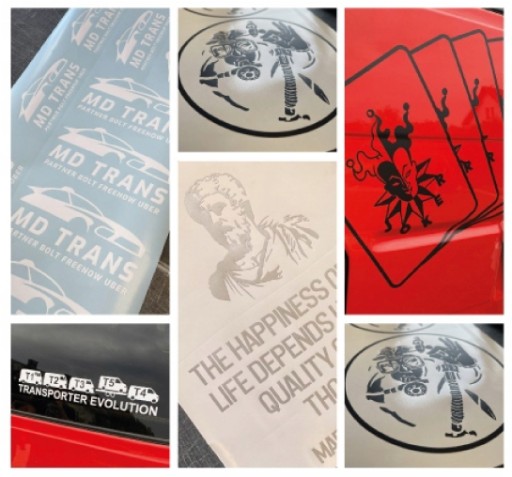 - Personalizowane naklejki (własny wzór, dowolny kolor) zarówno na karoserię, szybę auta lub na jakąkolwiek inną gładką powierzchnię.
