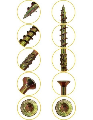 Wkręty przeznaczone są do połączeń elementów drewnianych i drewnopochodnych (płyta wiórowa, sklejka, drewno, płyta OSB, płyta MDF). Innowacyjna konstrukcja sprawia że praca z nimi to czysta przyjemność. Nie wymają wcześniejszego nawiercania. Głębokie i stabilne gniazdo TORX efektywnie przenosi moment obrotowy bez efektu wyskakującego bitu.
