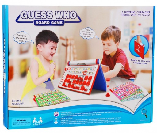 Zasady gry ZGADNIJ KTO - w nowej odsłonie graficznej + 8 dwustronnych plansz (ZGR.5039) Gracze siedzą naprzeciwko siebie. Pomiędzy zawodnikami rozkładacie dwustronną konsolę. Te same plansze oznaczone różnymi kolorami (niebieski i czerwony w lewym narożniku planszy) każdy z graczy umieszcza w swojej części konsoli. W górnej części konsoli będą się znajdowały 2 rzędy postaci. Wybieracie jedną z nich, tak aby przeciwnik tego nie widział. Zaznaczacie ją ruchomym okienkiem w kolorze Waszej części konsoli. Wszystkie pola poniżej (okienka) pozostawiacie otwarte. Zaczynamy grę. Gracze zadają sobie pytania, na które mogą usłyszeć tylko odpowiedzi "tak" lub "nie". Gracze pilnie się obserwują. Wszystkie okienka konsoli powinny być otwarte. Stopniowo z upływem czasu, zamykacie niektóre z okienek, eliminując postacie, które nie są potrzebne. Z lewej strony konsoli umieszczony jest suwak punktów 0-12. W grę możecie grać na różne sposoby. I wariant - tradycyjna wersja, gdzie zwycięzcą zostaje ten, kto jako pierwszy odgadnie postać przeciwnika. II wariant - wersja gry na czas. Zadajemy pytania bardzo szybko i staramy się w wyznaczonym czasie odgadnąć postać. Postacie te zaznaczamy kolorowymi szpilami. Zwycięzcą zostaje ten z graczy, który jako pierwszy odgadnie jakie postacie przedmioty wybrał jego przeciwnik. Zawartość zestawu - podwójna konsola dla 2 graczy, - 8 dwustronnych plansz oznaczonych kolorami dla 2 graczy, - klepsydra, - dodatkowe okienka do zaznaczania wybranych postaci, - szpile do zaznaczania wybranych postaci. Wymiary Wymiary konsoli ok. 25,5 cm x 31 cm x 3,5 cm. Wymiary pudełka ok. 33,5 x 42 cm x 7,5 cm.