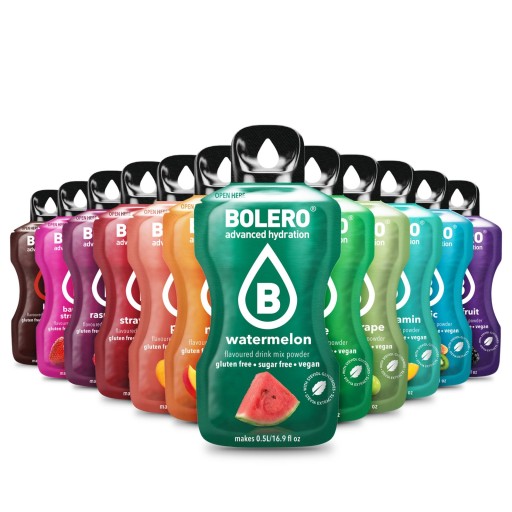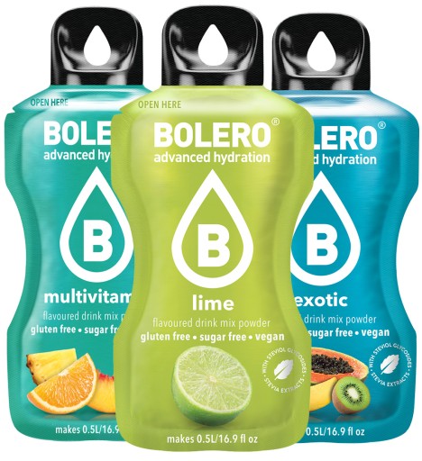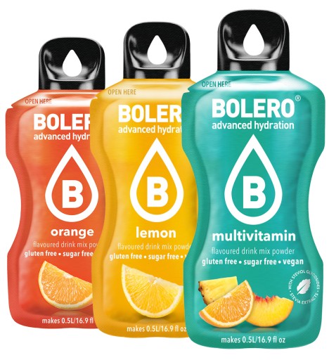 Bolero to bezcukrowe elektrolity w poręcznych saszetkach, które można rozpuścić w wodzie. Każda saszetka wystarcza na 0,5 - 1 litr wody.
