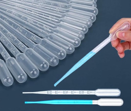 Zestaw silikonowych miarek do żywicy i gipsu zawiera 5 sztuk silikonowych kubków z miarką co 10ml oraz 3 plastikowe kroplomierze.