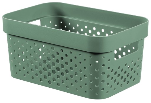 Popularne pojemniki ażurowe Infinity, pasujące do każdego wnętrza. Pojemniki zostały wyposażone w małe otwory na palce po obu stronach, co pomaga w ich przenoszeniu. Występują na innych naszych aukcjach w kilku rozmiarach oraz w kilku, atrakcyjnych kolorach. Chropowata powierzchnia ogranicza przemieszczenie się przedmiotów podczas przenoszenia pojemnika. Dzięki licznym otworom pojemnik można z powodzeniem używać w łazience, bądź kuchni. Pojemnik jest bez pokrywki. Na innych naszych aukcjach można znaleźć te same pojemniki już z pokrywkami.