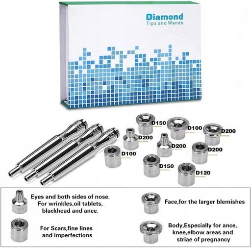- [Odłączany i wymiana głowicy diamentowej] jest wyposażony w 9 ukształtowaną głowicę diamentową różnych funkcji. Odłączany wspornik do wygodnego układu głowic diamentowych i różdżki. Regulowana intensywność próżniowa dostosowuje się do różnych leczenia obszaru. Jest garniturowy do twarzy, czoła, klatki piersiowej, nosa, szyi, w pobliżu obszaru oczu. Naturalny sposób dla zdrowszej i młodszej skóry.