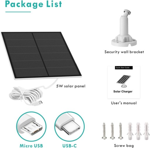- Łatwy montaż: panel słoneczny do kamery jest bardzo łatwy do podłączenia za pomocą kabla do ładowania. Wskazówki: Zastosuj środki ochrony przed wodą w porcie ładowania aparatu. Zawartość opakowania: 1 x panel słoneczny o mocy 5 W, 1 x regulowany uchwyt ścienny, 1 x torba na śruby, 1 x instrukcja obsługi (może nie być dostępna w polskiej wersji językowej), 1 x złącze USB-C.