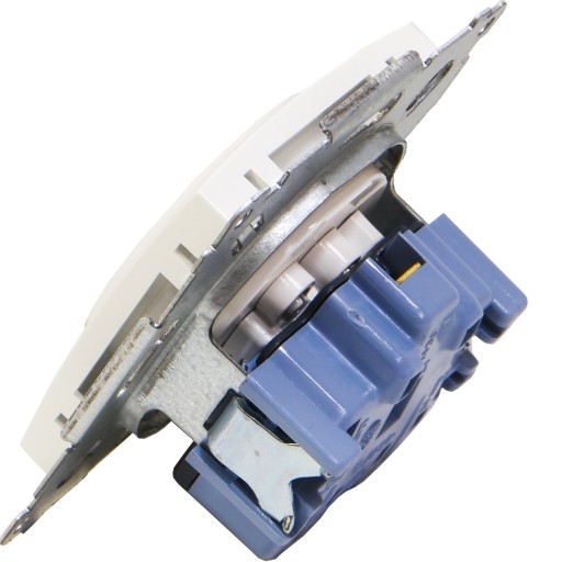 Standardowe gniazdo elektryczne pojedyncze z bolcem uziemiającym wyposażone w przesłony torów prądowych.