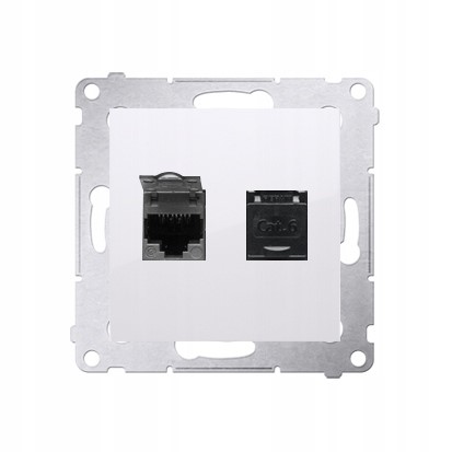 Gniazdo komputerowe (RJ45) podwójne przeznaczone do podłączenia dwóch kabli sygnałowych kategorii 6 (UTP) typu skrętka (Internet), z przesłoną przeciw kurzową.