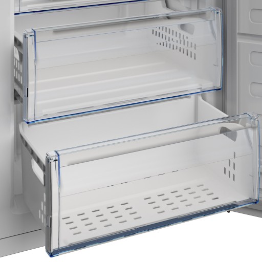 W zamrażarce znajduje się 6 pojemnych szuflad, w tym jedna o większej pojemności, dzięki czemu możesz przechowywać produkty o różnych rozmiarach. Wygodne, wysuwane szuflady pozwalają utrzymać porządek w środku oraz segregować jedzenie według kategorii.