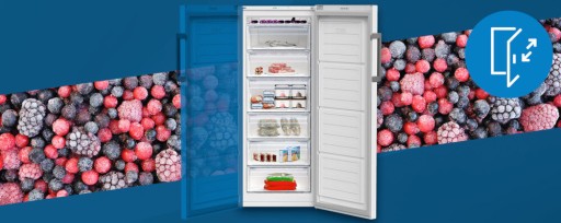 Dzięki drzwiom z możliwością zmiany kierunku otwierania, dostosujesz zamrażarkę do układu swojej kuchni lub pomieszczenia gospodarczego. W zależności od indywidualnych potrzeb, drzwi zamrażarki można zamontować z zawiasami po lewej lub prawej stronie, co pozwoli Ci na wybór kierunku, w którym będą się otwierać.