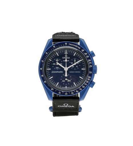 Intensywne połączenie granatów z czarnym paskiem VELCRO© spodoba się wielbicielom mroczniejszych klimatów. Dla kontrastu wskazówka sekundowa chronografu, wskazówki mniejszych tarcz i skala tachymetru są białe. Na każdej tarczy znajdują się oznaczenia OMEGA X SWATCH, kultowe logo Speedmaster oraz nowe logo MoonSwatch. Konstrukcja szkiełka, „ukryte” S pośrodku szkła kryształowego, drobny, wyrafinowany kolisty wzór na zewnętrznym pierścieniu tarczy i mniejszych tarczach, ostre i gładkie uszy koperty, kultowa „kropka nad 90” na bezelu ze skalą tachymetru i oczywiście wyjątkowe tworzywo Bioceramic to cechy wspólne wszystkich modeli, świadczące o zamiłowaniu marki do dbałości o detale. Wszystkie wskazówki godzinowe, minutowe i sekundowe chronografu, a także znaczniki godzin mają powłokę Superluminova, znakomicie widoczną w ciemności.