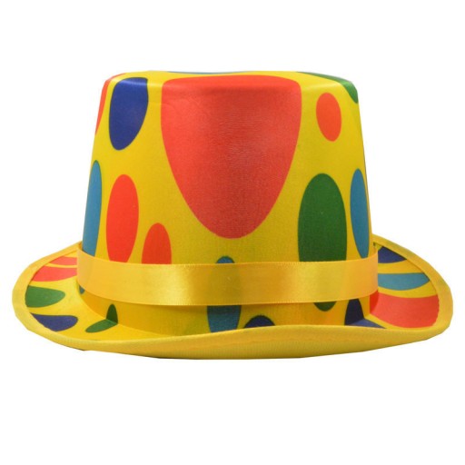 Żółty kapelusz klauna w kolorowe kropki z zółtym paskiem. Uzupełnienie stroju klauna na imprezy dla dzieci oraz dla dorosłych. Oryginalny design i wyraziste kolory sprawiają, że kapelusz się wyróżnia.