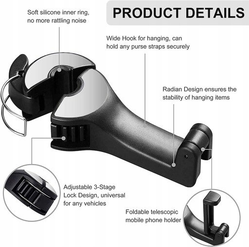 Zaktualizowany design - tylny hak do foteli samochodowych z uchwytem na telefon komórkowy, obracany o 360 stopni w poziomie, idealny do obrotów przedniego lub tylnego siedzenia. Funkcja blokady utrzymuje go stabilnie na miejscu. Tylny hak do siedzenia samochodowego ma konstrukcję blokady, zamknięcie zamka po instalacji jest bardziej stabilne. Uchwyt na torbę samochodową, gładka, prążkowana osłona zapobiega wypadaniu haczyków.