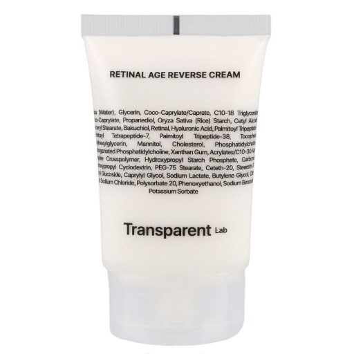 Transparent Lab - Retinal Age Reverse Cream - krem do skóry pozbawionej jędrności z retinalem, który poprawia jędrność skóry i redukuje zmarszczki, z peptydami o działaniu wygładzającym oraz bakuchiolem o działaniu przeciwzmarszczkowym i uelastyczniającym. Co więcej, w składzie znajduje się silnie nawilżający kwas hialuronowy i zmiękczający cholesterol. pH produktu wynosi 5,3-5,8.