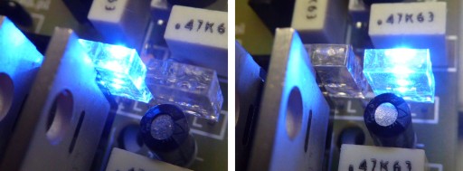 Zmiana czasu świecenia maksymalnego dokonywana jest potencjometrem P2 (przekręcanie przy pomocy małego płaskiego śrubokrętu). Zmniejszenie czasów sprawia, że schody po załączeniu po kolei będą krócej świeciły wszystkie łącznie, zanim rozpocznie się proces płynnego wygaszania. Do wyboru ustawienia z przedziału od około 2s do około 2 minut, przy czym środkowe położenie potencjometru odpowiada czasowi na poziomie około 40s.