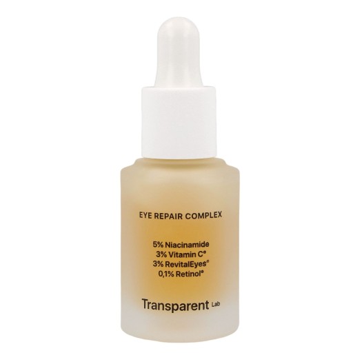 Transparent Lab - Eye Repair Complex - preparat przeznaczony do wieczornej pielęgnacji delikatnej skóry w okolicach oczu. Działa przeciwzmarszczkowo dzięki zawartości witamin A i C, które mają silne właściwości antyutleniające. Niacynamid wspiera nocną regenerację skóry. Formuła zawiera też naturalny ekstrakt z liści herbaty, który również działa kojąco i regeneracyjnie. Betaina i gliceryna dbają o odpowiednie nawilżenie skóry. Kosmetyk pozytywnie wpływa na kondycję delikatnych okolic oczu. Jest polecany szczególnie na noc ze względu na gęstą, żelową konsystencję.