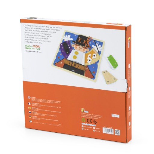 Tablica Manipulacyjna Magik od marki VIGA pozwoli rozwinąć umiejętności przydatne do samodzielnego ubierania się. Poprzez zabawę w ubieranie małego magika dzieci poznają podstawowe czynności przydatne do własnoręcznego ubierania się, takie jak sznurowanie, zapinanie suwaków, guzików, zatrzasków czy klamer. Do każdej z tych czynności jest oddzielna część ubrania małego iluzjonisty z tablicy manipulacyjnej i można ją ćwiczyć osobno. Pod nimi za to znajdziemy również poukrywane elementy sztuczek magika: króliczka, karty, gołębia i bukiet kwiatów, dzięki czemu tablice można również wykorzystać do zabawy w zapamiętywanie.