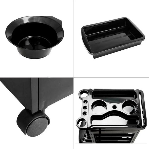 Wózek jest wykonany z tworzywa sztucznego wysokiej jakości. Posiada kółka, które ułatwiają przestawianie z jednego miejsca w drugie. Jest łatwy w użytku i czyszczeniu. Dostępny w kolorze czarnym.