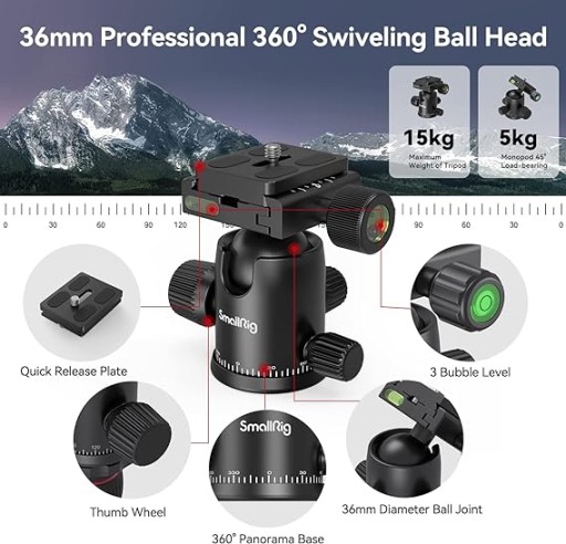 - METALOWA GŁOWICA KULOWA 36 MM 360 °: Średnica metalowej głowicy kulowej wynosi 36 mm, aby zapewnić stabilność statywu. Może wytrzymać do 33 funtów (15 kg). Specjalnie zaprojektowana metalowa głowica kulowa 36 mm może obracać się o 360 stopni, umożliwiając robienie zdjęć pod dowolnym kątem w poziomie i pionie.
