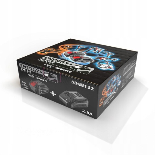 - ładowarka należąca do serii dla profesjonalistów i majsterkowiczów Energy+ marki GRAPHITE. Urządzenie dedykowane jest do ładowania akumulatorów litowo-jonowych o napięciu 18 V. Maksymalny przepływ prądu wynosi 2,3 A. Ładowarka wyposażona została w system kontroli napięcia i temperatury, dzięki któremu zapewnia odpowiednie bezpieczeństwo podczas użytkowania, dbając o nieprzegrzewanie się korpusu. Napięcie ładowania to 22 V, a zasilania 230 V~50 Hz. Ładowarka posiada diody informujące o postępie pracy urządzenia oraz wytrzymały, elastyczny przewód o długości 2 m.
