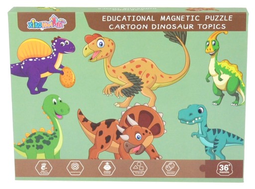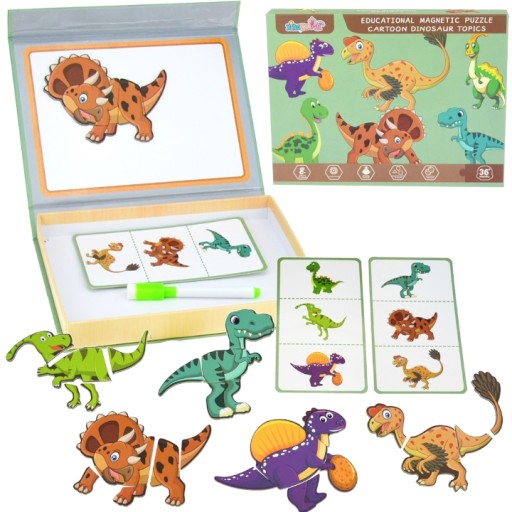 Układanka magnetyczna, w formie pudełka. W środku znajdziemy tablicę magnetyczna na której możemy układać z puzzli dinozaury.