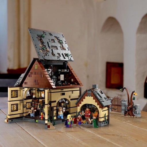 Domek można otworzyć na wiele sposobów, by obejrzeć szczegóły wnętrza, w tym muzealny sklep z pamiątkami, kociołek ze świecącym klockiem LEGO do oświetlania ognia pod spodem, księgę zaklęć i sypialnię czarownic, w której roi się od nietoperzy.