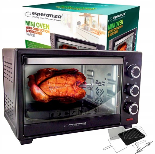 Mini piekarnik z konwekcją i rożnem NAPOLI; Konwekcyjny mini piekarnik Esperanza NAPOLI w łatwy sposób pomoże zrobić pyszną pizzę, zapiekankę, frytki albo upiecze mięso lub ryby. Piekarnik posiada także funkcje rożna, na którym bez problemu można upiec np. całego kurczaka. Specjalne ukształtowanie tylnej ścianki pozwoli upiec w całości pizzę naprawdę solidnych rozmiarów. Dolną część można łatwo i bez zbędnego bałaganu oczyścić, a to dzięki wbudowanej tacce na okruchy. Piekarnik cechuje ładny i elegancki design, dzięki czemu będzie pasował do każdej kuchni.