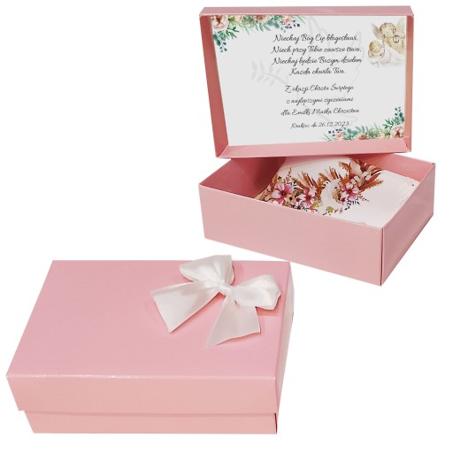 Wewnątrz pudełka znajduje się miejsce na wyjątkową dedykację. To idealna przestrzeń, aby podziękować od serca Matce Chrzestnej za jej wsparcie i obecność w życiu Waszego dziecka. Dedykacja ta staje się cenną pamiątką i wyrazem miłości i wdzięczności.