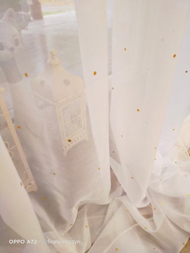Oferujemy Państwu firankę woalową białą z ozdobnymi aplikacjami uroczych groszków, kropek w kolorze złota.