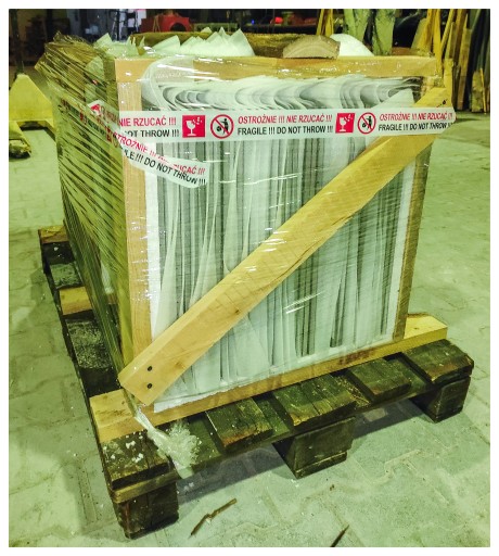 Wszystkie płyty wysyłamy na palecie dodatkowo zabezpieczone styropianem oraz pianką poliuretanową. Całość skręcona w skrzynię z desek tak by każda płyta dotarła w całości.