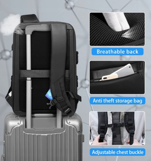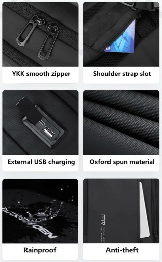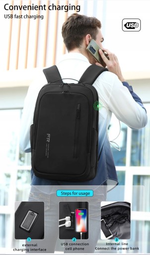 Dwukomorowy plecak na laptopa marki FRN o symbolu FRN8038 został wykonany z wodoodpornych i wytrzymałych materiałów – oxford i PVC. Komora z przodu plecaka otwierana jest na płasko, jak walizka. Znajduje się tutaj miejsce na zapakowanie ubrań, które odseparowane jest siatkową przegrodą, oraz dwie duże kieszenie. W drugiej komorze z tyłu plecaka znajduje się dedykowana, miękka kieszeń na laptopa w rozmiarze do 17,3" zapinana na rzep oraz sześć kieszonek na akcesoria. Z przodu plecaka znajduje się kieszeń na podręczne rzeczy z kieszonkami na akcesoria i długopisy oraz przypinką do kluczy, oraz druga mniejsza kieszeń z wodoodpornym zamkiem. Po bokach plecaka umieszczono kieszenie na napój lub parasolkę zapinane na zamek. Z lewej strony znajduje się zewnętrzne gniazdo USB, dzięki czemu nie ma konieczności wyciągania power banka z plecaka, aby naładować telefon lub inne przenośne urządzenie. Szelki plecaka o ergonomicznym kształcie oraz tylna ściana plecaka wyłożone są grubymi, oddychającymi gąbkami, dzięki czemu jest on wygodny przy dłuższym noszeniu. Plecak posiada również pas piersiowy, którym można spiąć szelki, aby lepiej rozłożyć ciężar przy maksymalnym zapakowaniu plecaka. Na tylnej ścianie umieszczono szeroki pas, dzięki któremu można założyć plecak na rączkę torby lotniczej, oraz bezpieczną kieszeń np. na telefon lub portfel. Plecak posiada uchwyt służący do przenoszenia plecaka w ręce. Niebywałą zaletą tego plecaka jest możliwość powiększenia go o dodatkowe 8cm (12l) poprzez rozpięcie dodatkowego zamka, biegnącego po całym obwodzie plecaka.