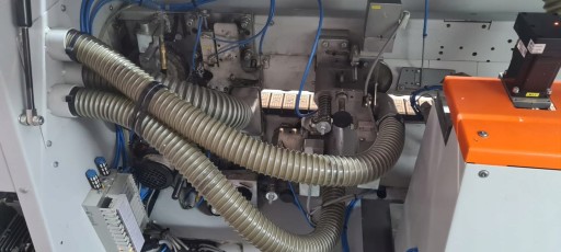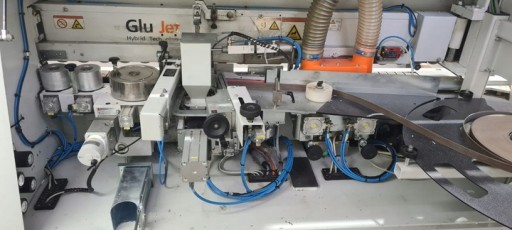 - Obrabiarka posiada agregat obróbki wstępnej płyty. Okleinuje wąskie krawędzie standotronem, PCV, ABS i zarabia naroża, oraz przykleja doklejki z drewna litego do 8 mm