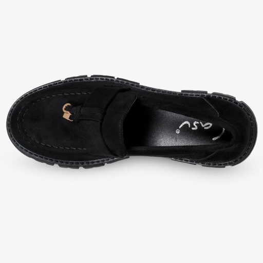Czarne mokasyny damskie model G23X7-B zostały wykonane z wysokogatunkowej, zamszowej skóry ekologicznej co gwarantuje doskonałą jakość, wygodę i dopasowanie do stopy. To eleganckie i stylowe obuwie, które można nosić na wiele różnych okazji. Mają płaską, bieżnikową podeszwę, która zapewnia dobrą przyczepność, komfort i stabilność podczas chodzenia. Ich główną cechą wyróżniającą jest subtelna i efektowna ozdoba umieszczona na przedniej części cholewki, która dodaje butom wyjątkowego uroku i elegancji. Można je nosić zarówno do formalnych, jak i nieformalnych strojów. Świetnie pasują do spodni, zarówno klasycznych, jak i jeansów, a także do sukienek i spódnic. Są znakomitym dodatkiem do garderoby, ponieważ czarny kolor jest uniwersalny i łatwo go zestawić z innymi elementami stroju. Jeśli szukasz butów, które będą zarówno stylowe, jak i wygodne, sprawdź ofertę Casu