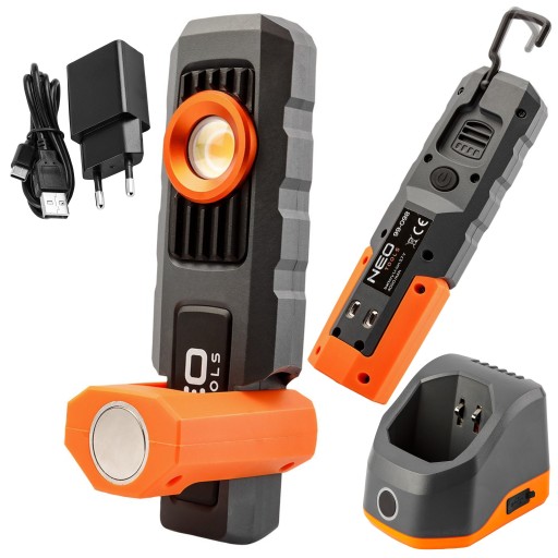 Lampa do dobierania kolorów 2 w 1 + stacja i ładowarka 99-098 marki NEO wyposażona w diodę LED: COB oraz diodę UV. Posiada współczynnik oddania barw CRI>90. Charakteryzuje się funkcjami: COB ciepły - COB naturalny - COB chłodny - TOP UV LED-OFF, gdzie maksymalne moce wyjściowe wynoszą: 380 lumenów (ciepły) / 350 lumenów (naturalny) / 390 lumenów (zimny). Z kolei czas pracy szacowany jest od 4 do 4,5 godziny, w zależności od wybranego trybu. Lampa posiada baterię 3,7 V 4000 mAh i zasilacz 5V 1A. Wbudowany port ładowania typu C umożliwia pełne naładowania urządzenia w 5 godzin. Lampa do dobierania kolorów lakierów samochodowych w świetle naturalnym i UV będzie niezbędna w każdym warsztacie samochodowym. Sprawdzi się także w przypadku wycieków płynów chłodniczych, jeżeli wcześniej zastosowany zostanie odpowiedni czynnik z domieszką. Urządzenie posiada stopień wodoodporności IP67. Jego rozmiar wynosi 185 x 50 x 32 mm, a waga (bez podstawy) 245 g. Lampa oferowana jest w zestawie ze stacją, ładowarką, hakiem oraz magnesem na podstawie. Rekomendowana profesjonalistom jak i majsterkowiczom.