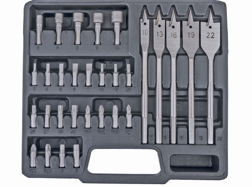 Zestaw wierteł i bitów wykonane z wysokiej jakości materiałów w opakowaniu z mocnego tworzywa sztucznego.