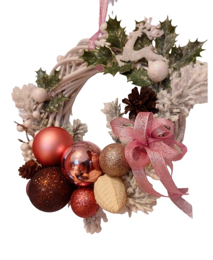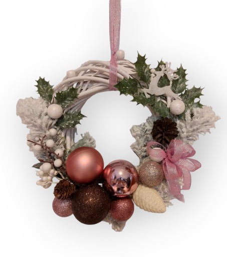 Bożonarodzeniowy wianek na drzwi w kolorystyce różowej