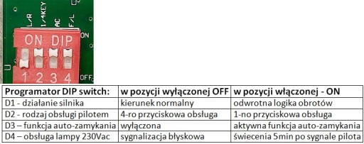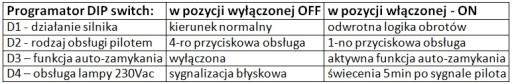 D4 – sygnalizacja świecenie 5 min. jest polecana do bram garażowych -> świecenie przez 5 min. po zadziałaniu pilotem.