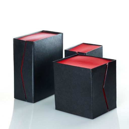Pudełko, w jakie zapakowany jest sześcian, wykonano z litej tektury oklejonej ozdobnym papierem w kolorze czarnym i czerwonym.