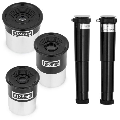 Powiększenie teleskopu wynika z zastosowanej w nim optyki. Dzięki zastosowaniu aż 3 różnych okularów oraz powiększającej soczewki Barlowa uzyskujemy następujące wartości powiększeń: