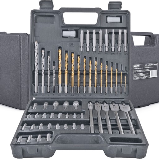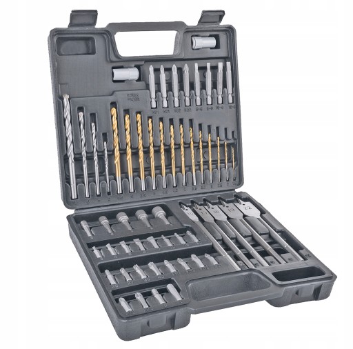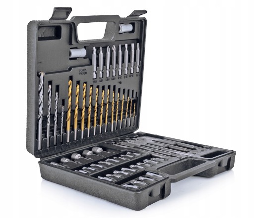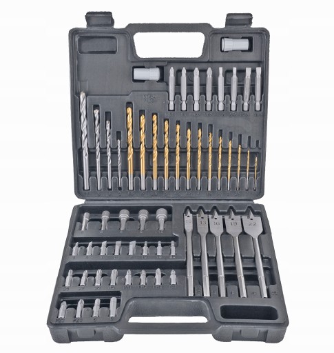 Wysokiej jakości zestaw charakteryzuje się różnorodnością wierteł i bitów, zapewnia to możliwość wykonania wielu prac.