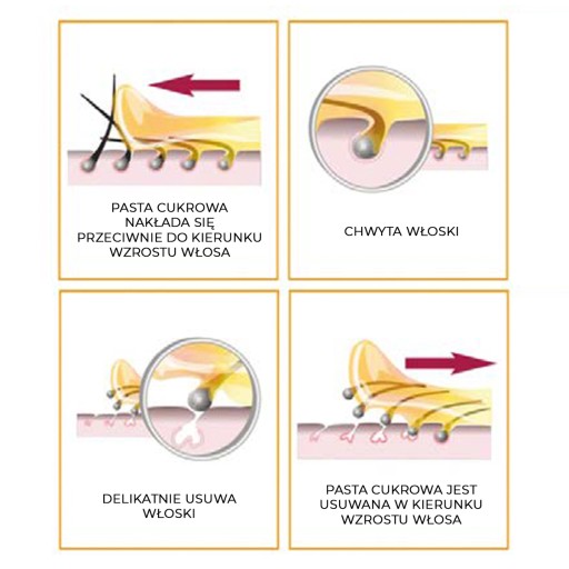 Pasta cukrowa nie urywa włosków, ale usuwa je wraz z cebulkami, dzięki czemu skóra pozostaje przez długi czas gładka, a włoski stają się coraz słabsze. Łatwo zmywa się ją ze skóry przy użyciu ciepłej wody.