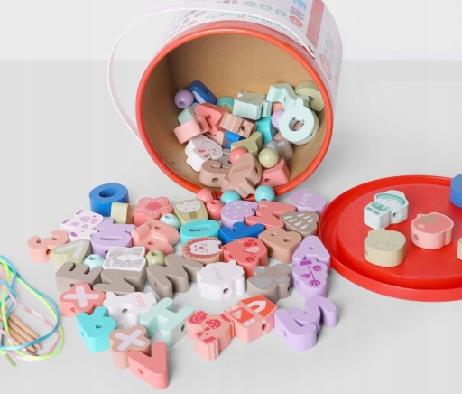 ⭐ KORALIKI KLOCKI DREWNIANE DO NAWLEKANIA MONTESSORI W KSZTAŁCIE ALFABETU, CYFR, ZWIERZĄT DO NAWLEKANIA ZAPAKOWANE W ŁADNE WIADERKO