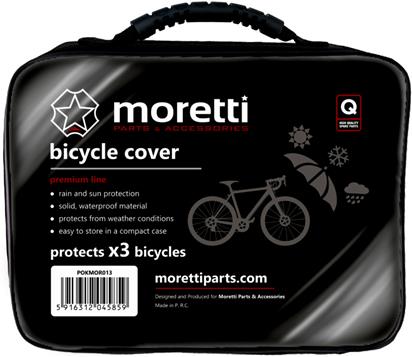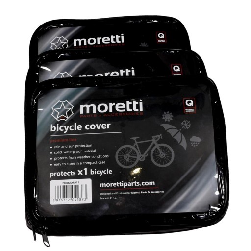 Wysokiej jakości pokrowiec rowerowy firmy MORETTI wykonany z bardzo trwałego i odpornego na wszelkie czynniki atmosferyczne materiału. W komplecie etui na pokrowiec. Wykonany w taki sposób, że bez problemu możemy zasłonić cały rower