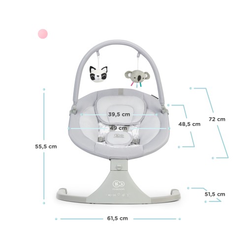 - Bujaczek ma 12 wbudowanych piosenek oraz możliwość ustawienia prędkości bujania na 5 poziomach.