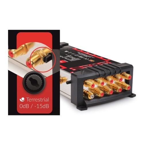 Pozłacane gniazda w sposób istotny zmniejszają straty sygnału na przyłączu kabli antenowych, oraz brak zjawiska utleniania. Multiswitch automatycznie rozpoznaje rodzaj sygnału jaki będzie przekazywany do tunerów. W instalacji należy uwzględnić podłączenie multiswitcha do anteny satelitarnej o średnicy nie mniejszej niż 0,8m i konwertery Quattro oraz antenę telewizji naziemnej. Rozdzielenie sygnału satelitarnego i naziemnego wychodzącego z multiswitcha odbywa się za pomocą gniazd abonenckich końcowych. Zasilanie multiswitcha odbywa się za pośrednictwem zewnętrznego zasilacza dzięki czemu wyeliminowane jest zjawisko zwiększonej temperatury pracy będące częstym powodem uszkodzeń urządzenia.
