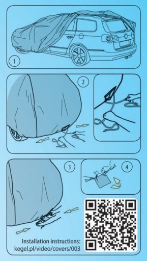 Przed założeniem pokrowca na samochód złożyć boczne lusterka oraz złożyć lub odkręcić antenę. Pokrowiec założyć na czysty i suchy samochód stroną z nadrukiem na zewnątrz. Dla ułatwienia prawidłowego ułożenia pokrowca na samochodzie w pokrowiec wszyta jest wszywka FRONT z przodu pokrowca i REAR z tyłu pokrowca (oznaczenie pokrywają się z przodem i tyłem samochodu).